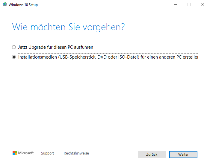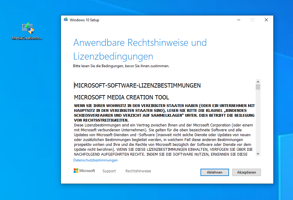 Falls ihr lieber Ubuntu installiert, könnt ihr diesen Beitrag lesen ;-). Leider ist die Windows-10 ISO mittlerweile so groß, dass diese nicht mehr auf einer DVD platz hat. Es gibt zwar eine paar Trick, dass dies funktioniert, aber die machen meist viele Probleme. Daher empfehle ich immer einen Bootstick zu erstellen. Dies funktioniert recht einfach mit dem Windows media creation tool, welches direkt hier heruntergeladen werden kann. Das Tool als Administrator ausführen und die Schritte auf den Bildern ausführen.